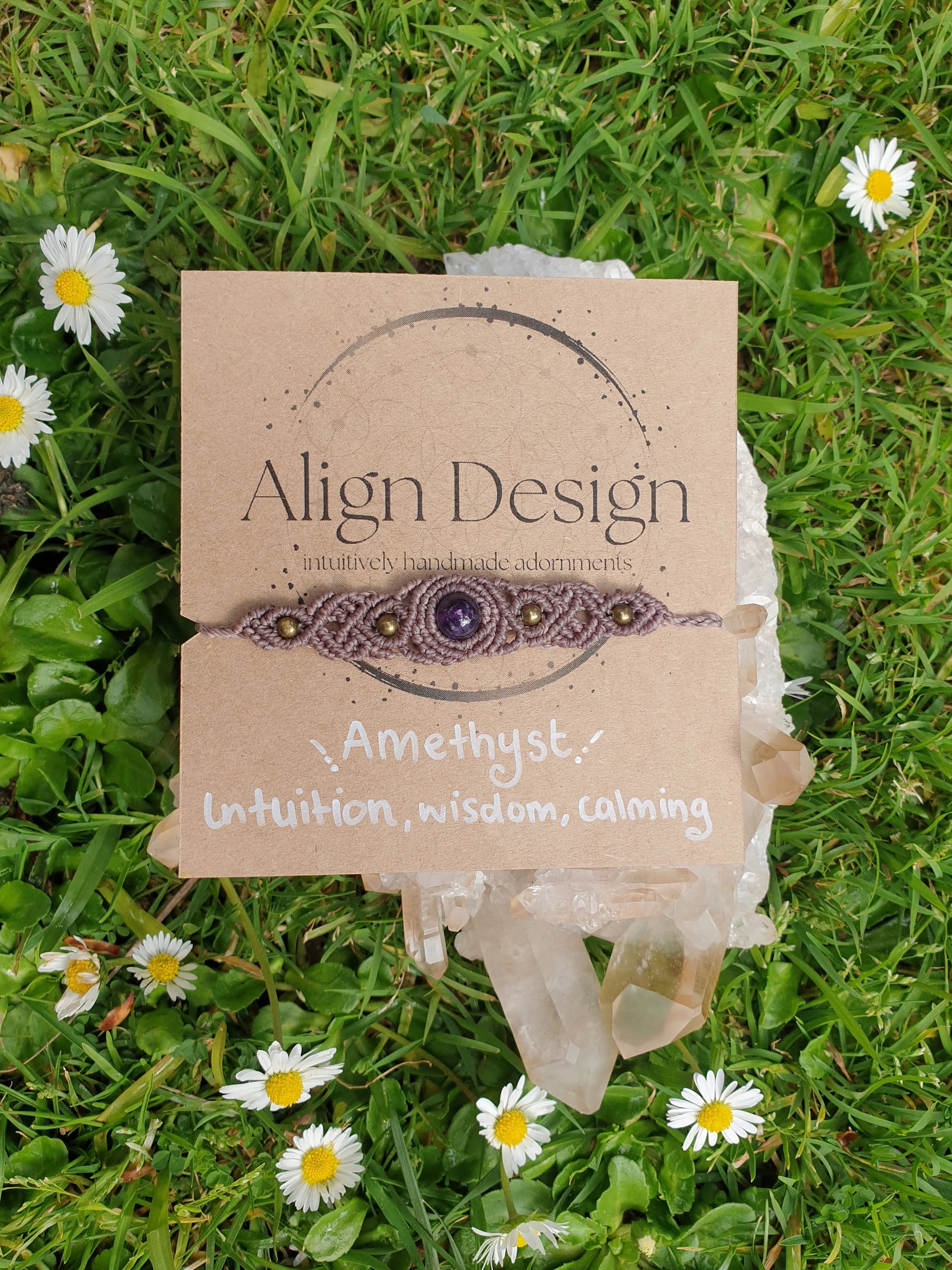 Woven with Brazilian waxed cord for durability and includes amethyst and brass beads.