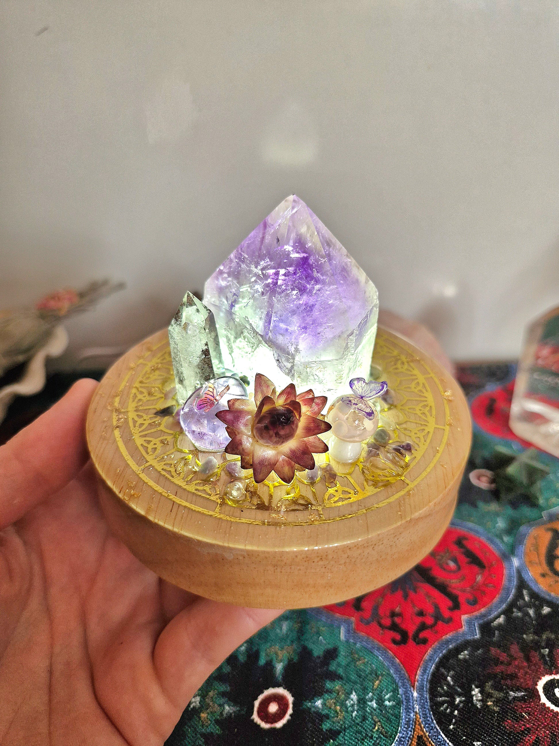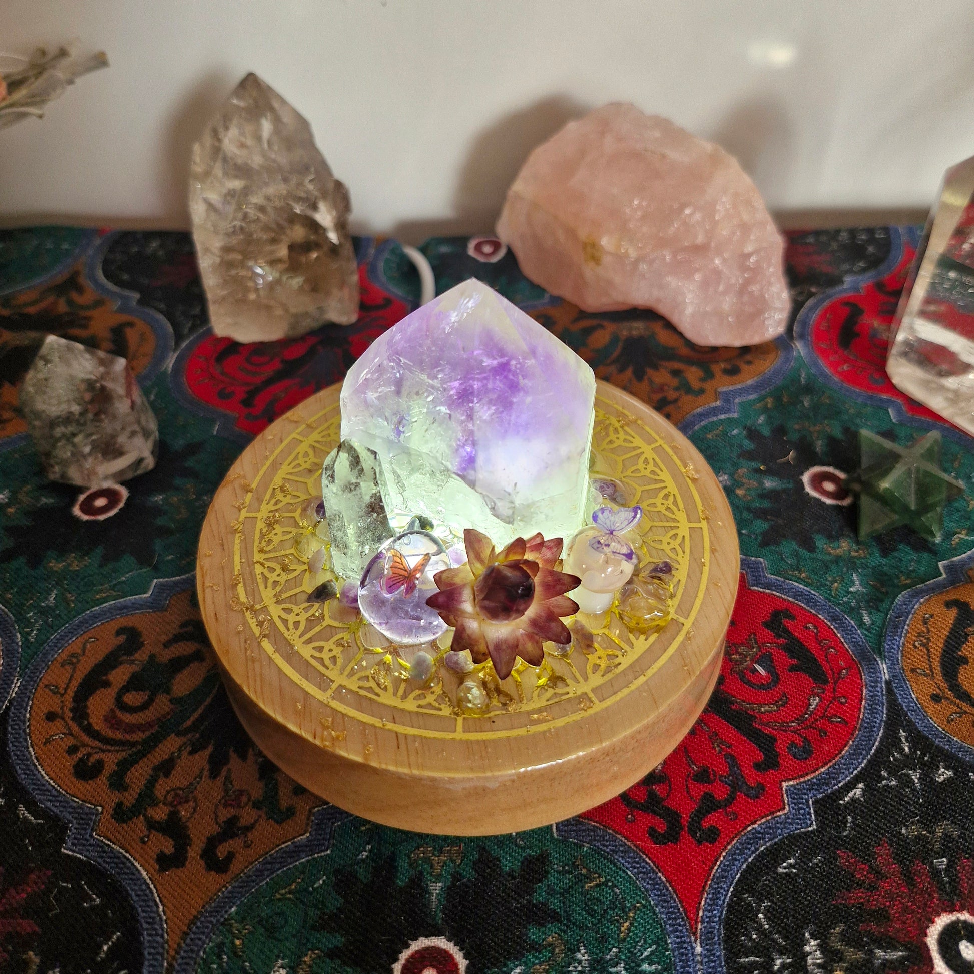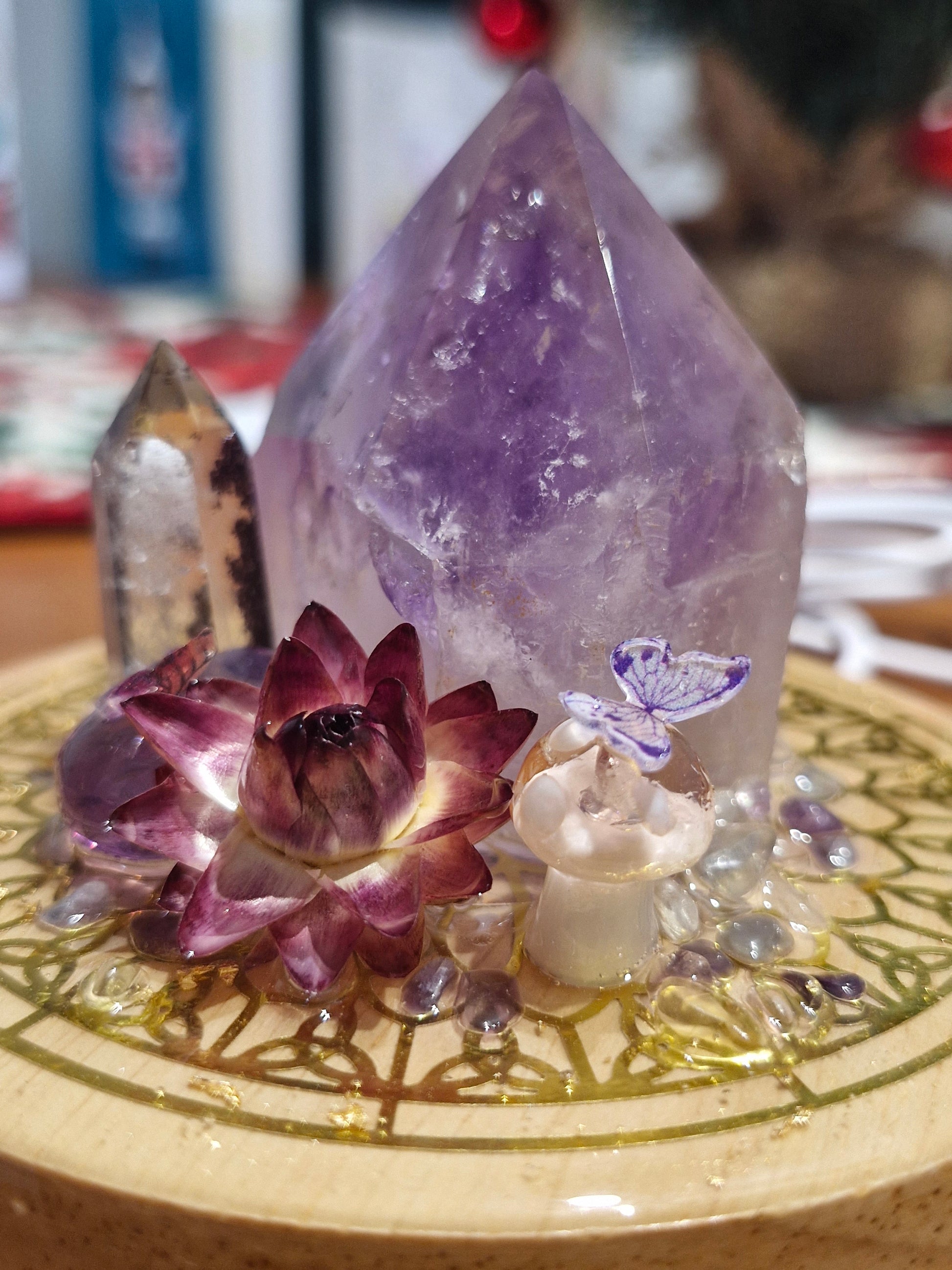 Amethyst point with lodolite point, mushrooms, flowers, butterflies and magical fluorite pebbles top off this one of a kind creation where art perfectly blends natural elements