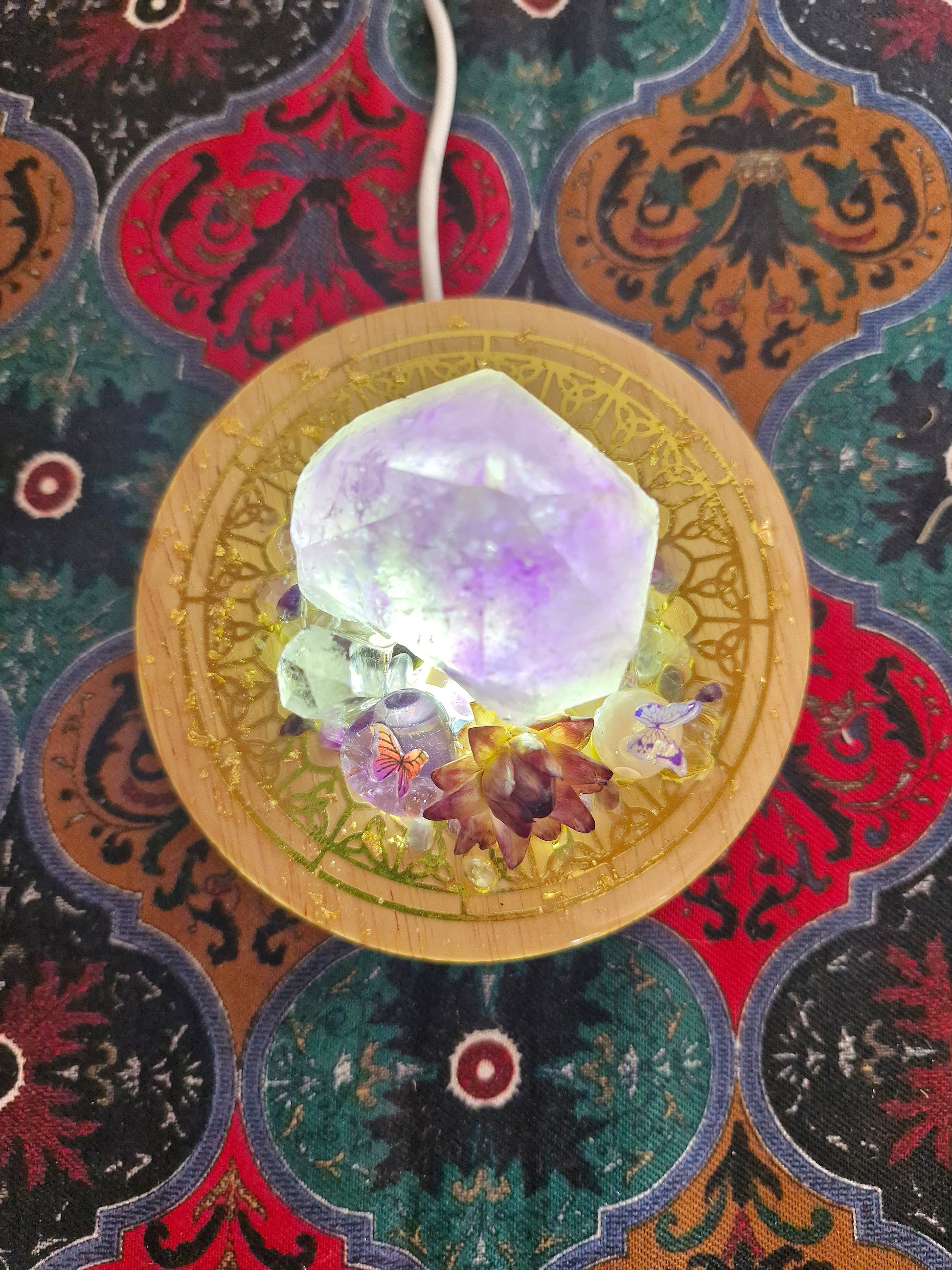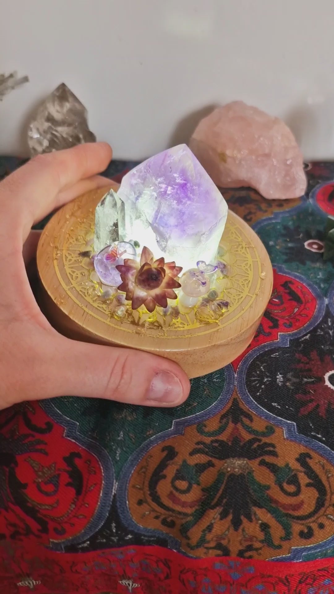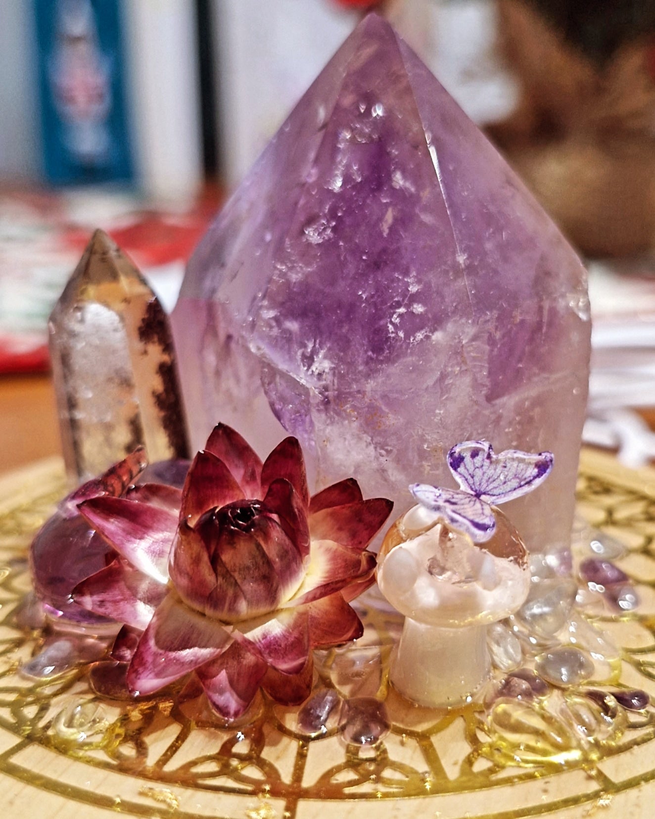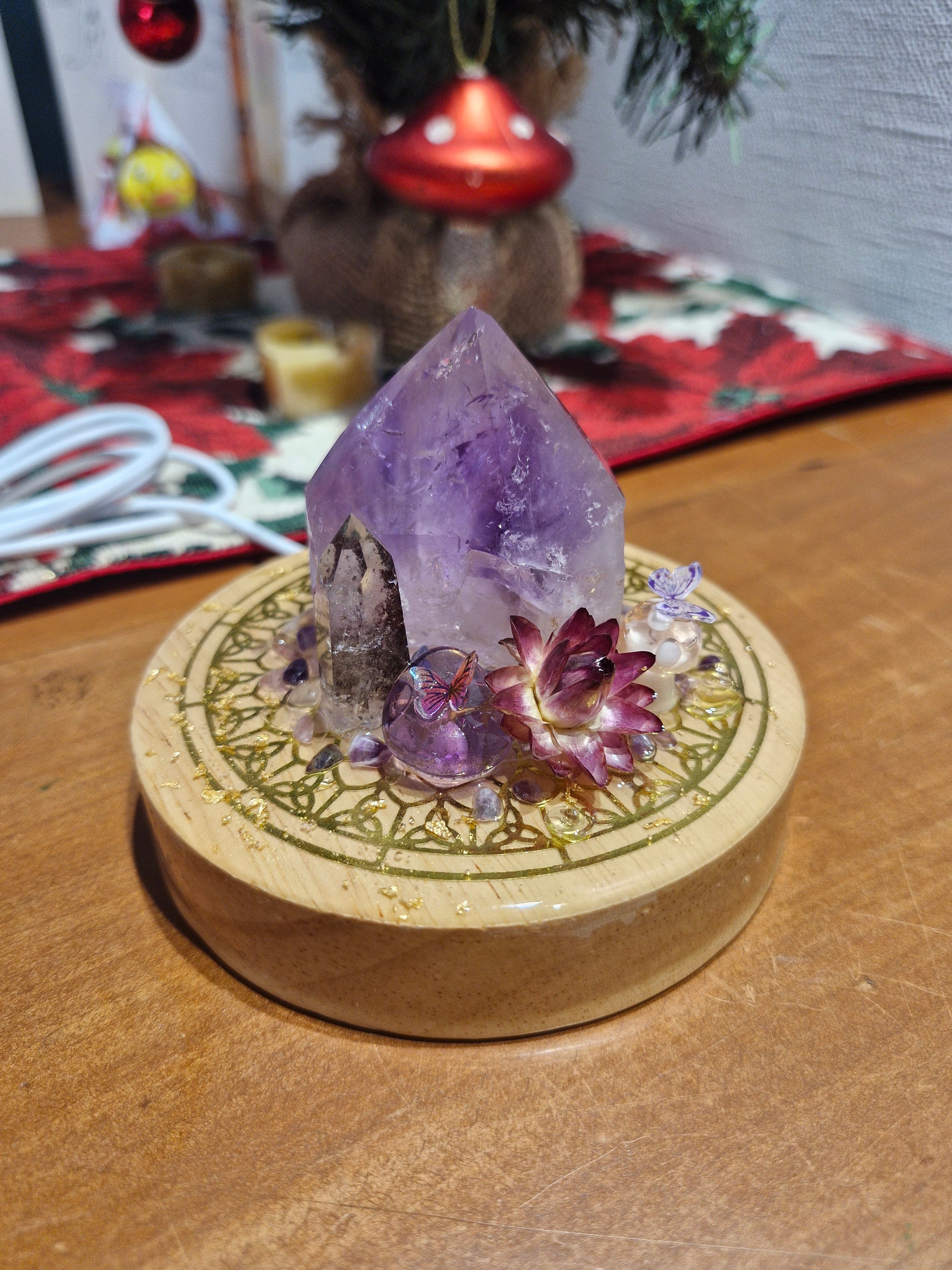 Amethyst point with lodolite point, mushrooms, flowers, butterflies and magical fluorite pebbles top off this one of a kind creation where art perfectly blends natural elements