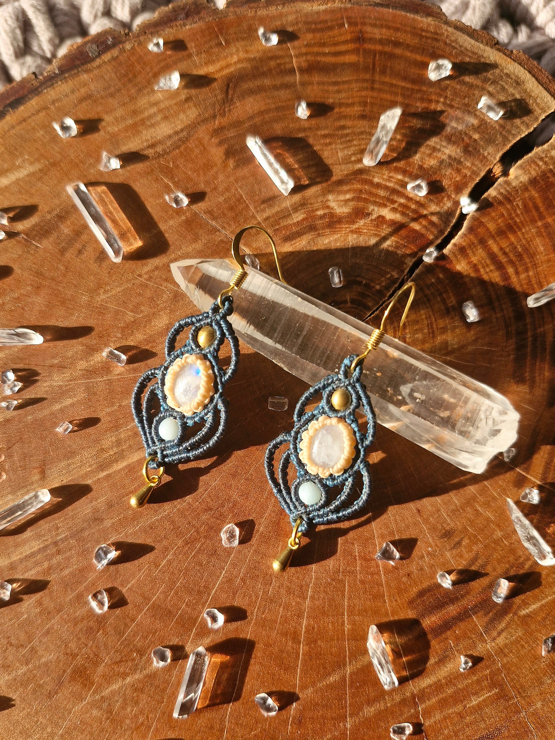 Micro macramé earrings with moonstone cabochons, aquamarine and brass beads.