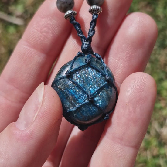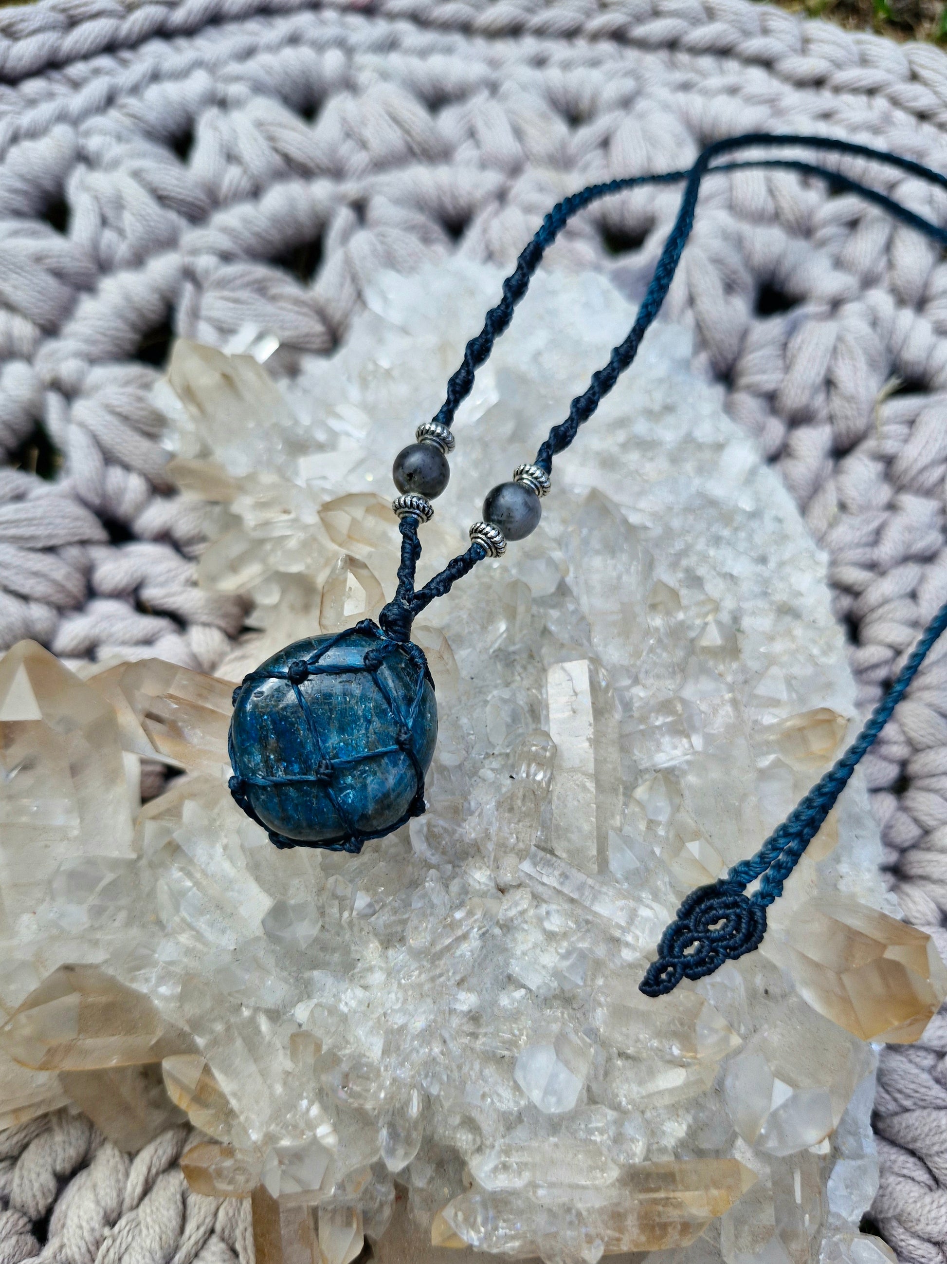 Lovingly made in Aotearoa New Zealand with Brazilian waxed cord, natural polished Blue Kyanite and labradorite beads.