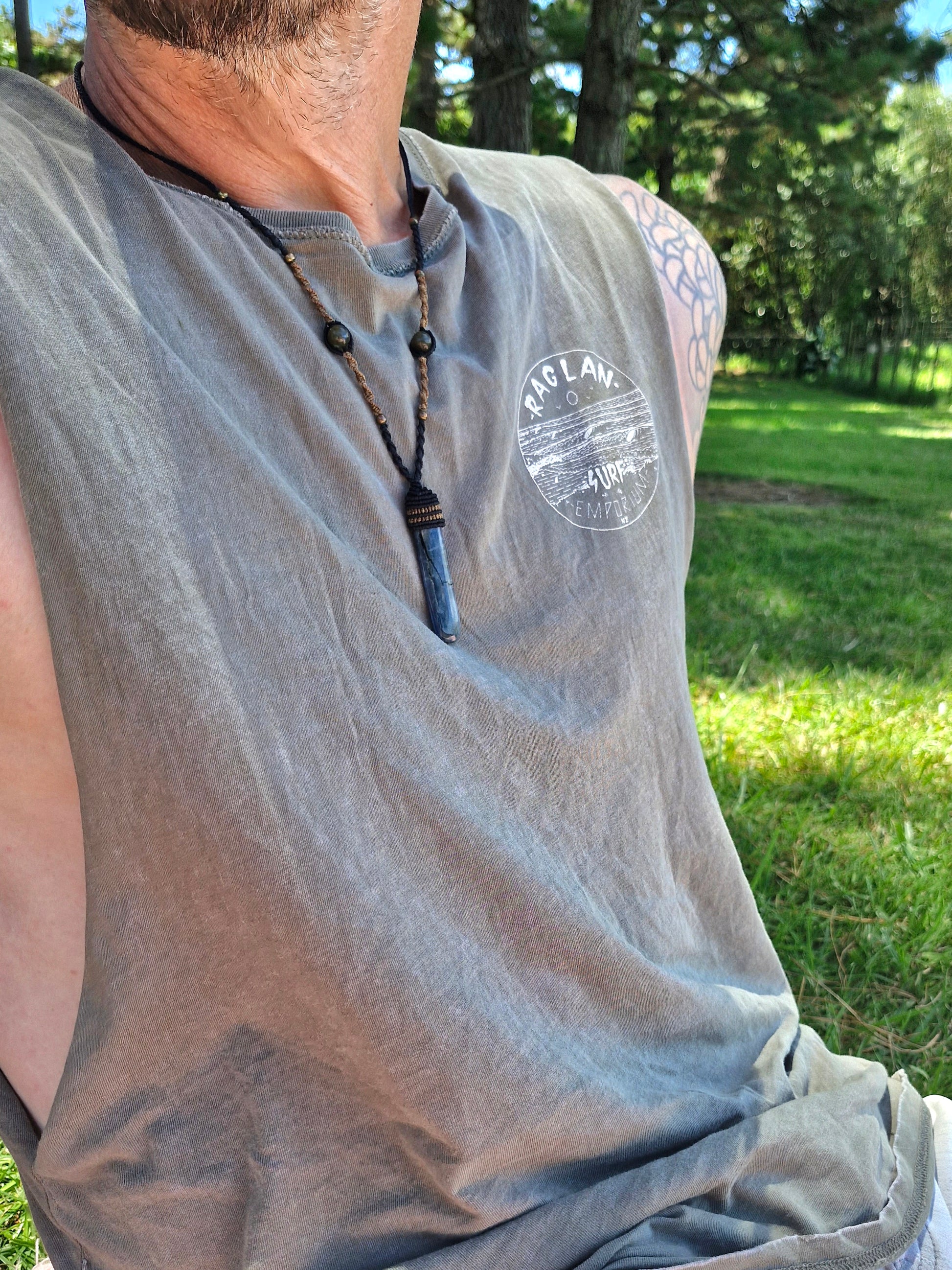 Intuitively handmade in Aotearoa New Zealand with Brazilian waxed cord, natural polished Blue Kyanite, brass and labradorite beads.