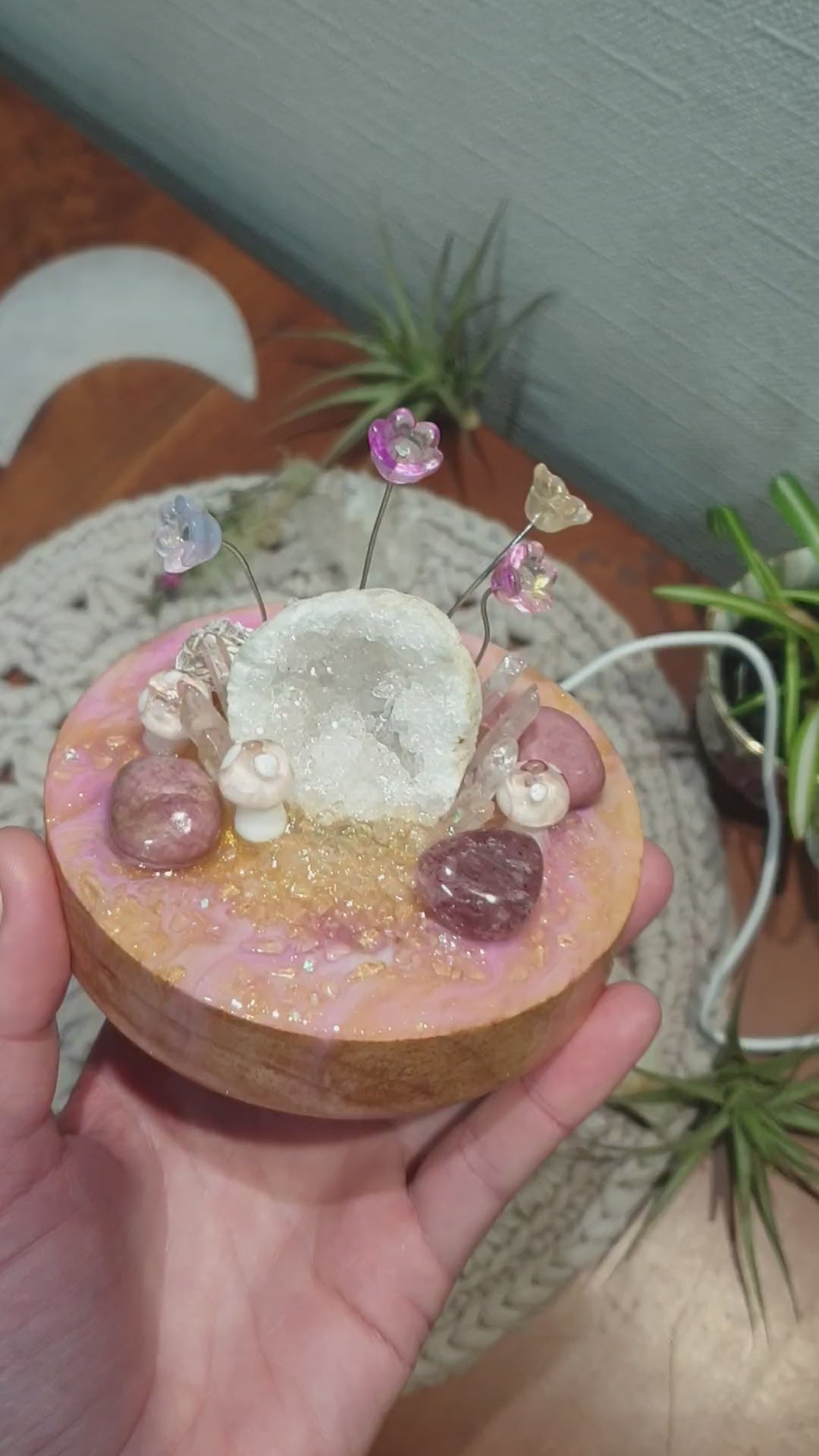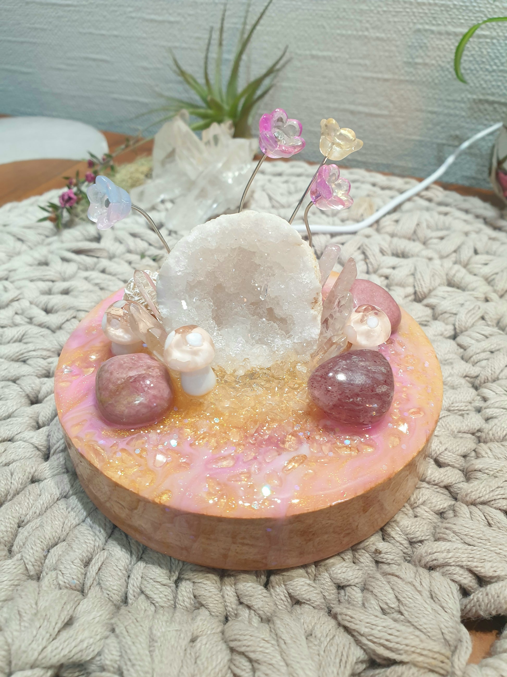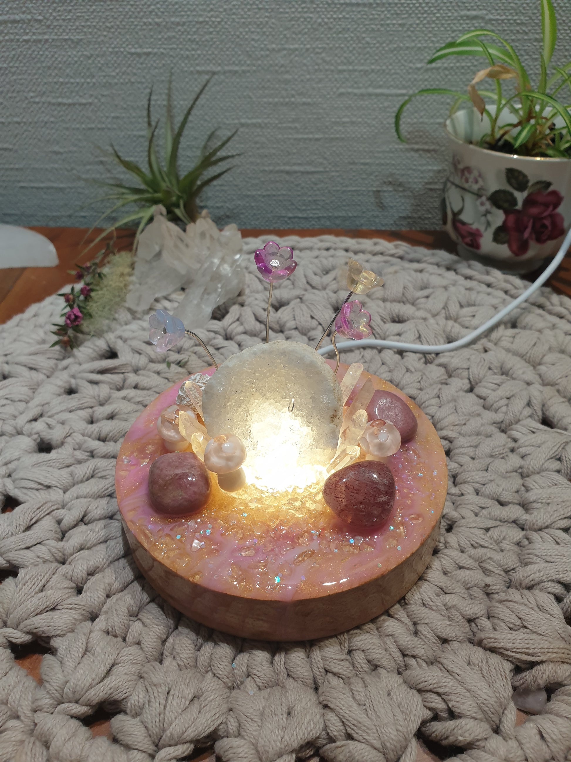 Clear Quartz geode sitting on a wooden light base, with magical resin designs.