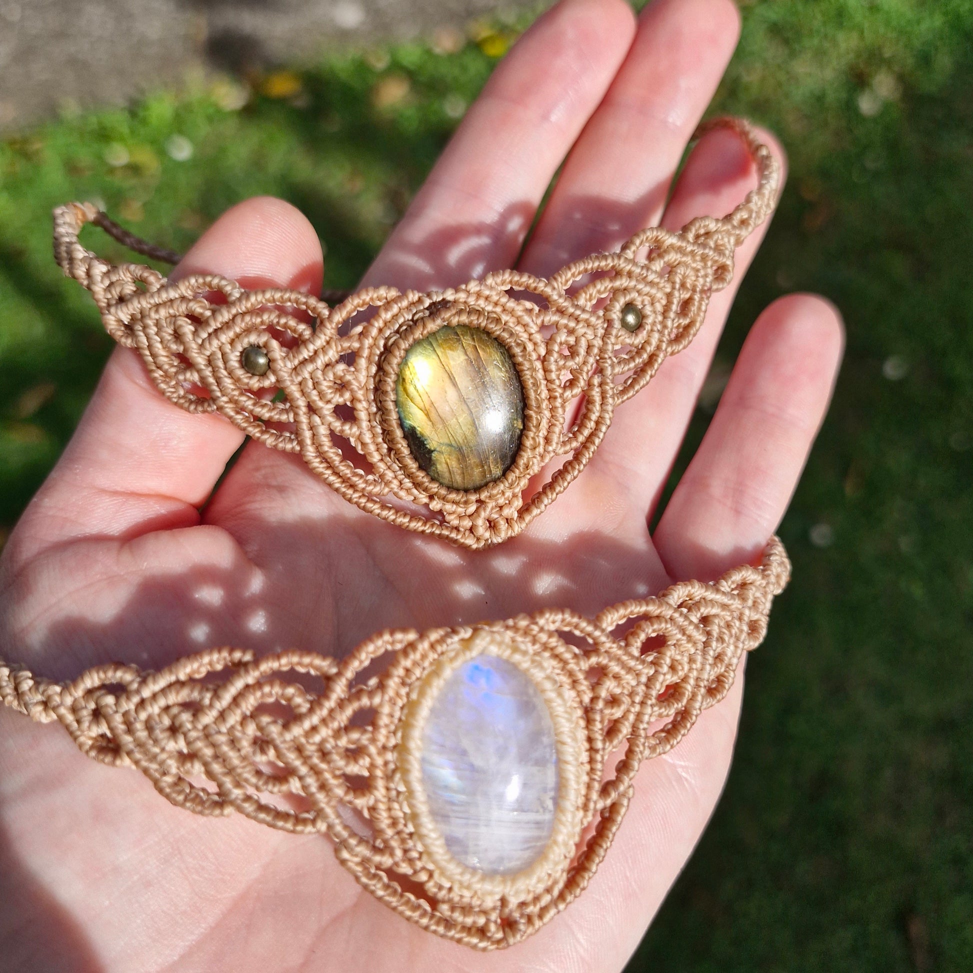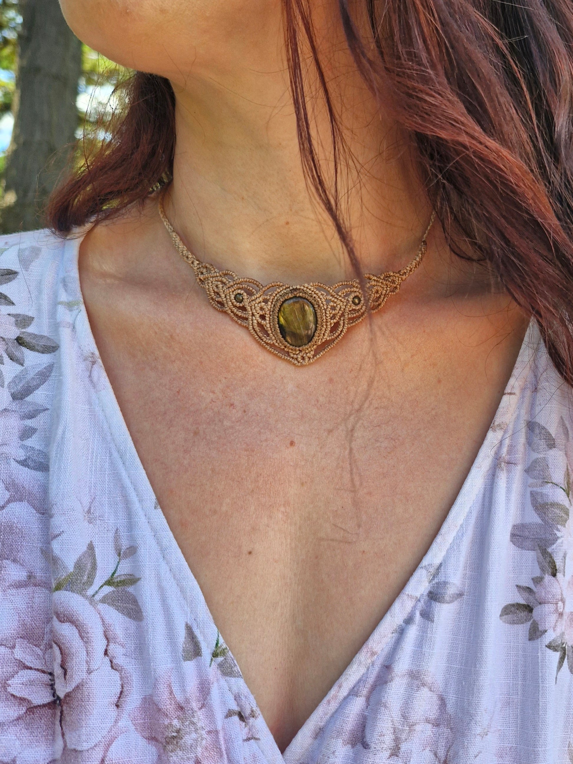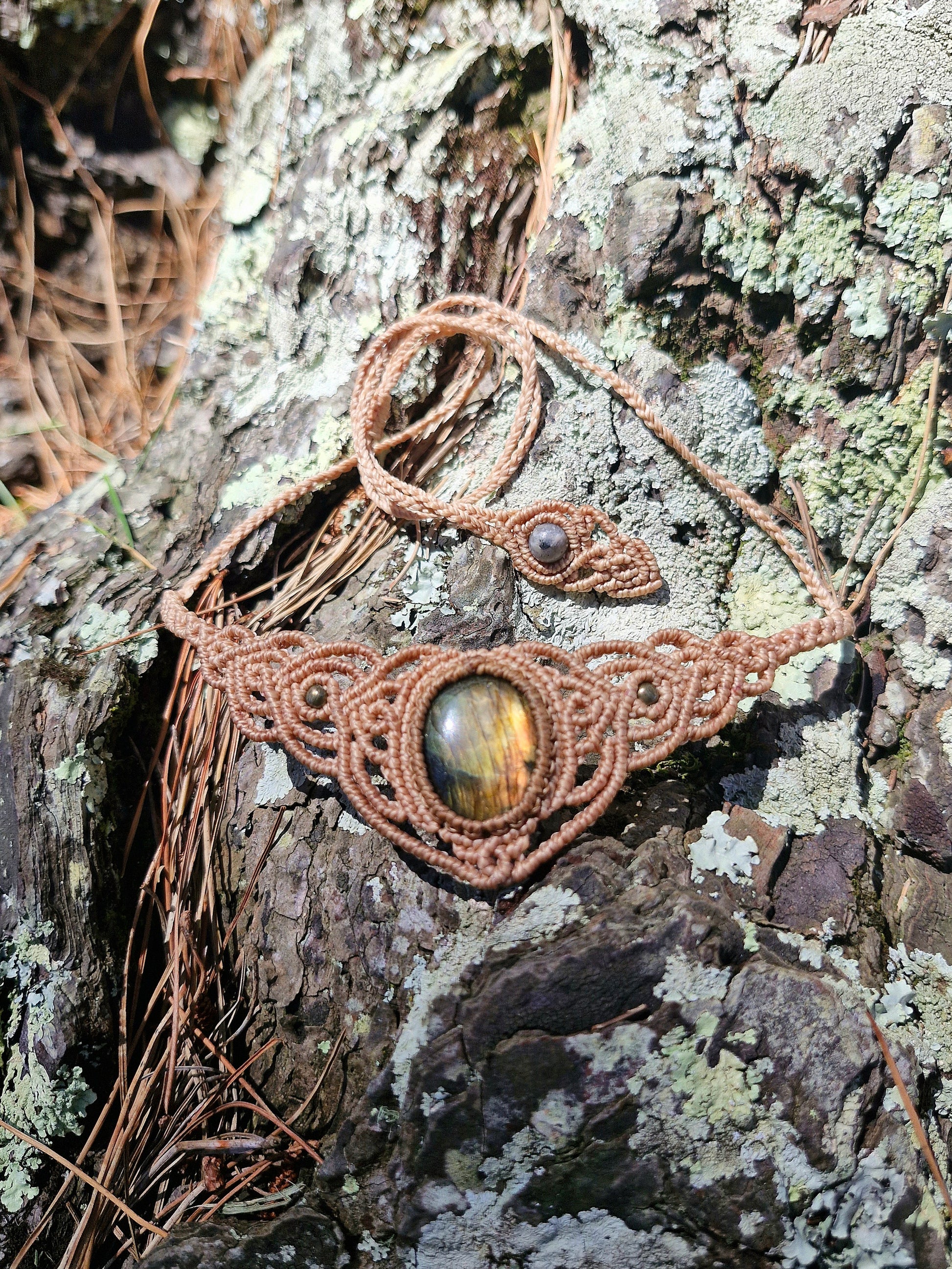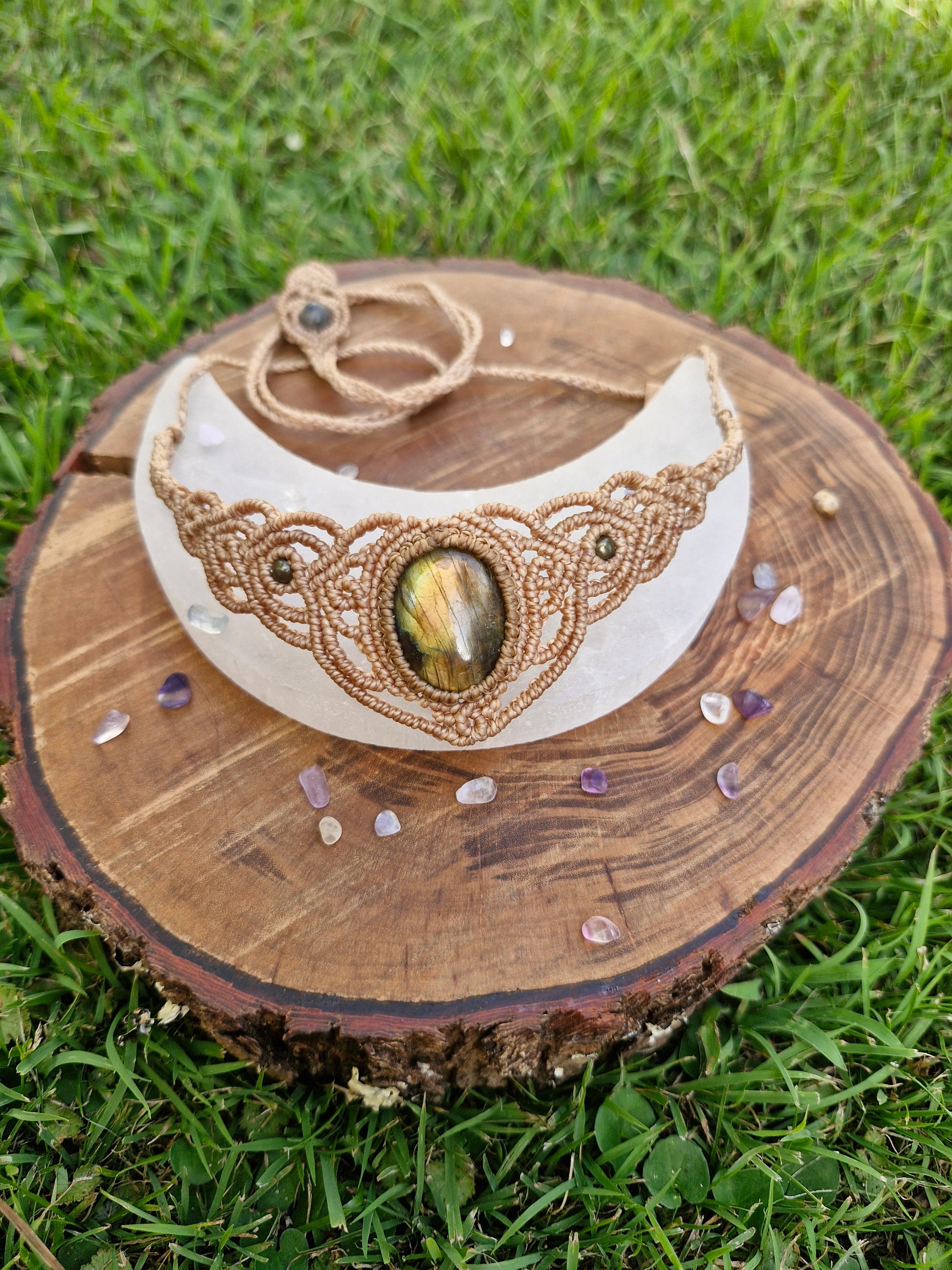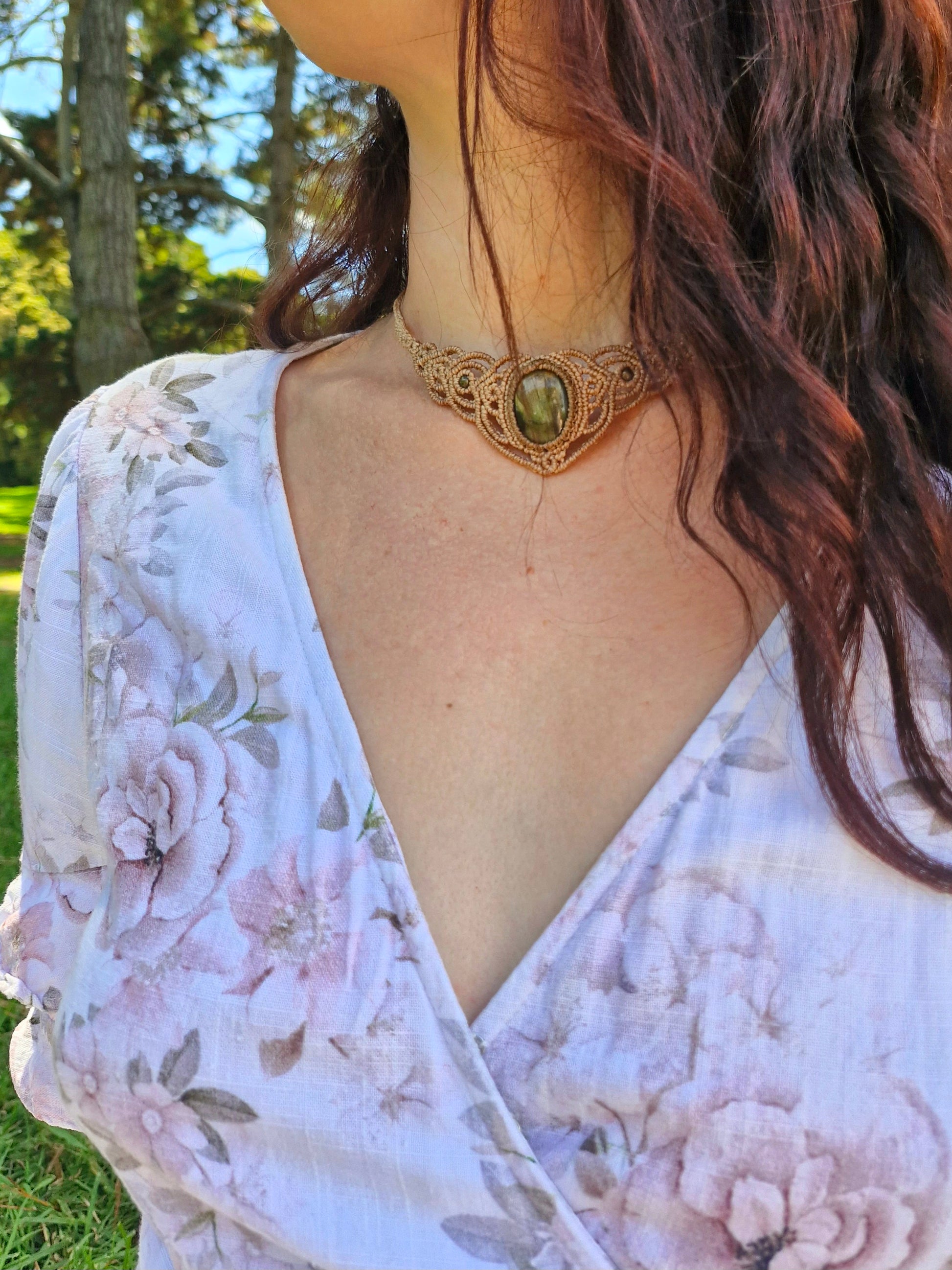 Labradorite crystal with tones of gold, yellow and green. A stunning necklace that can be worn as a necklace, choker or fairy crown. What ever your preference may be.