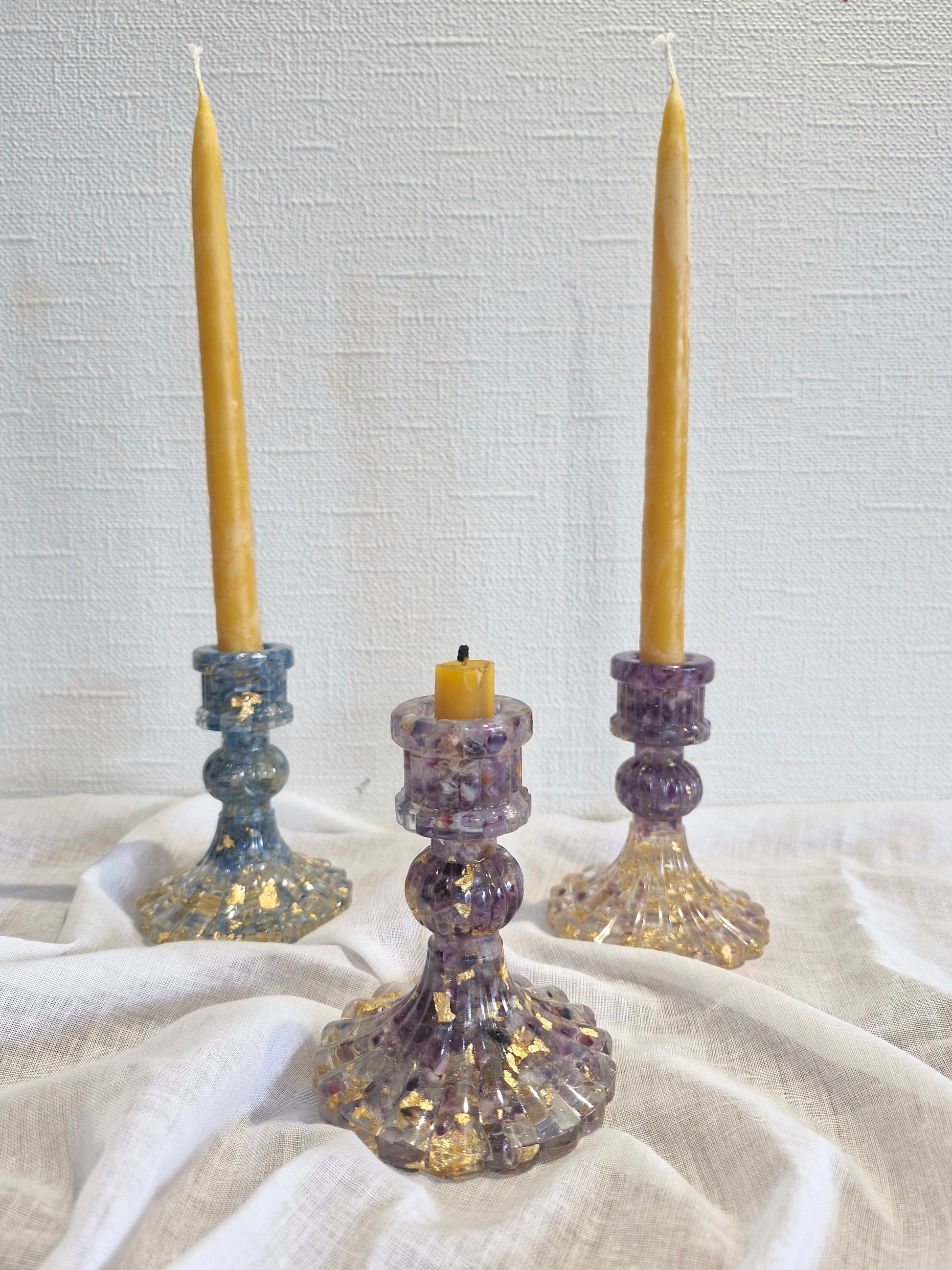 These beautiful candle holders are all handmade in Aotearoa using natural crystal chips, resin and other elements.