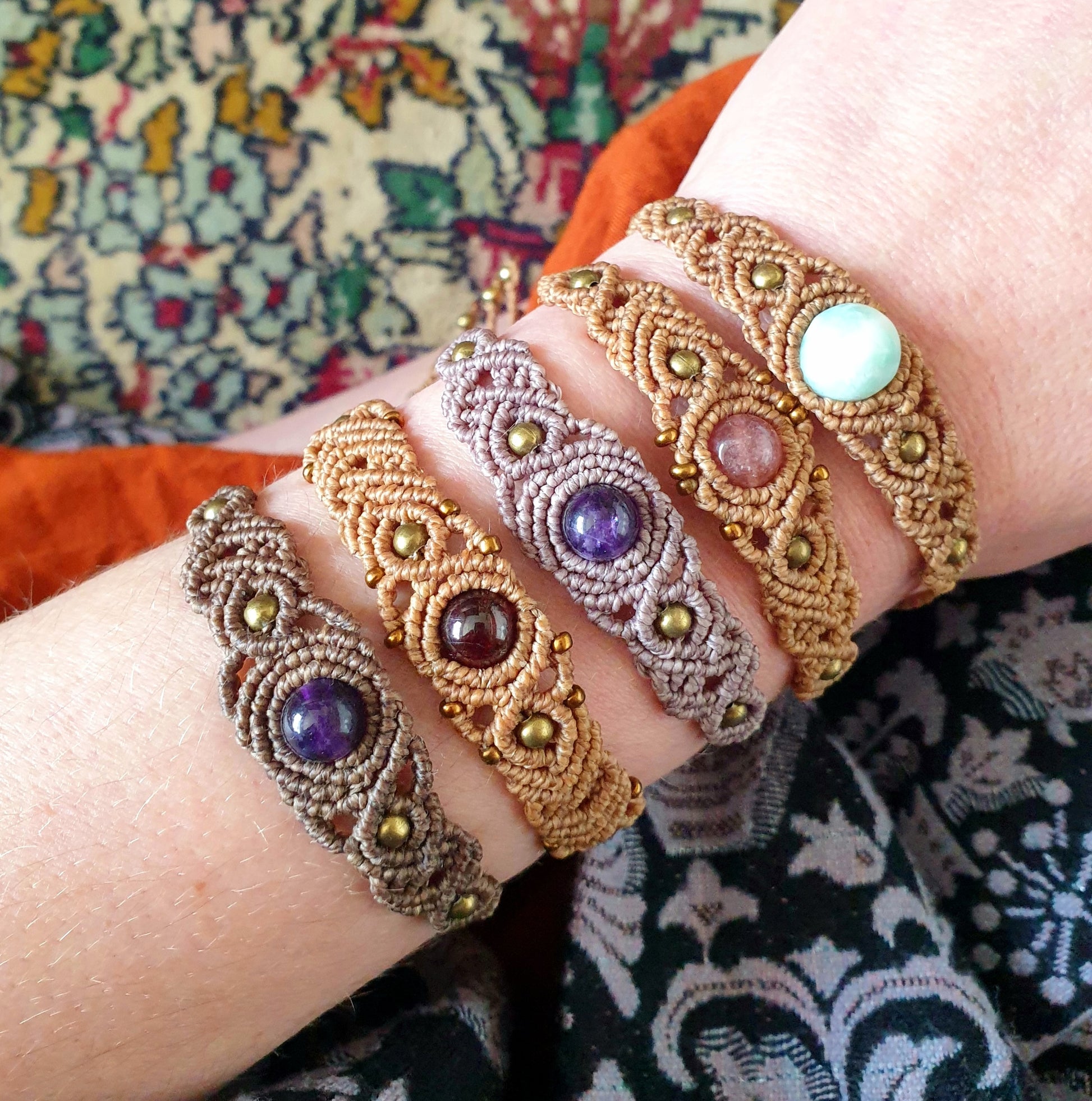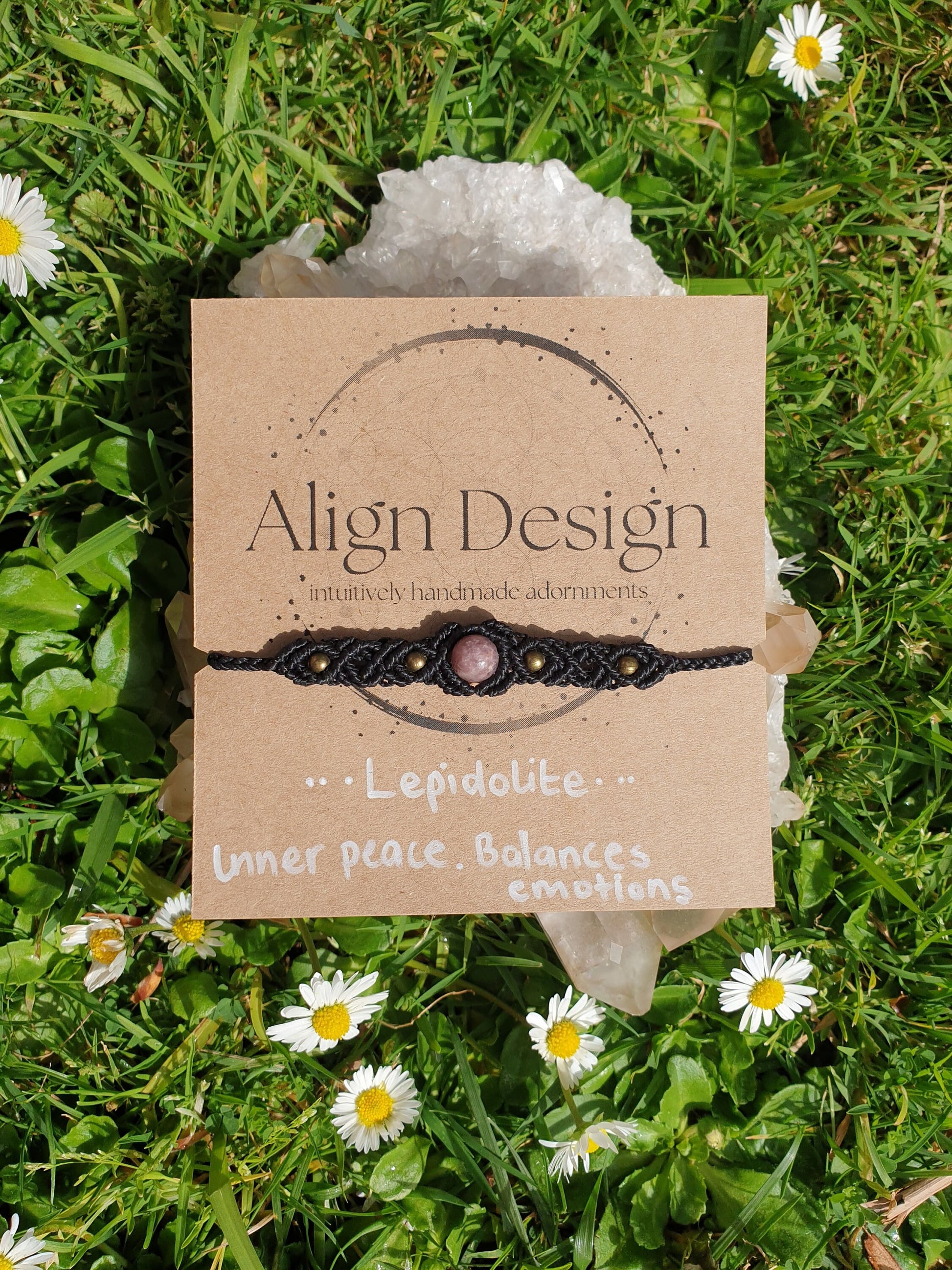 Woven with Brazilian waxed cord for durability and includes lepidolite and brass beads.