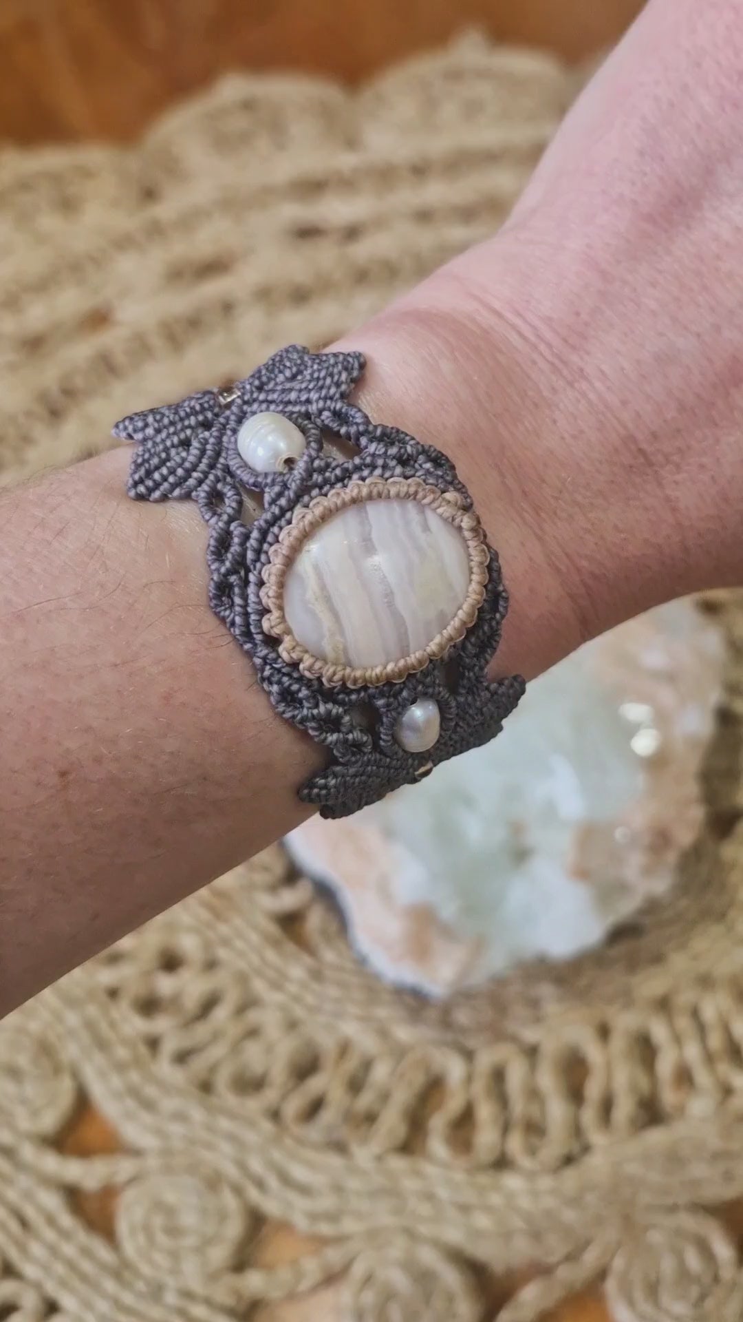 Intuitively handmade in Aotearoa New Zealand. Micromacrame - using mauve purple Brazilian waxed cord, mangano calcite cabochon, fresh water pearls and Japanese glass beads.