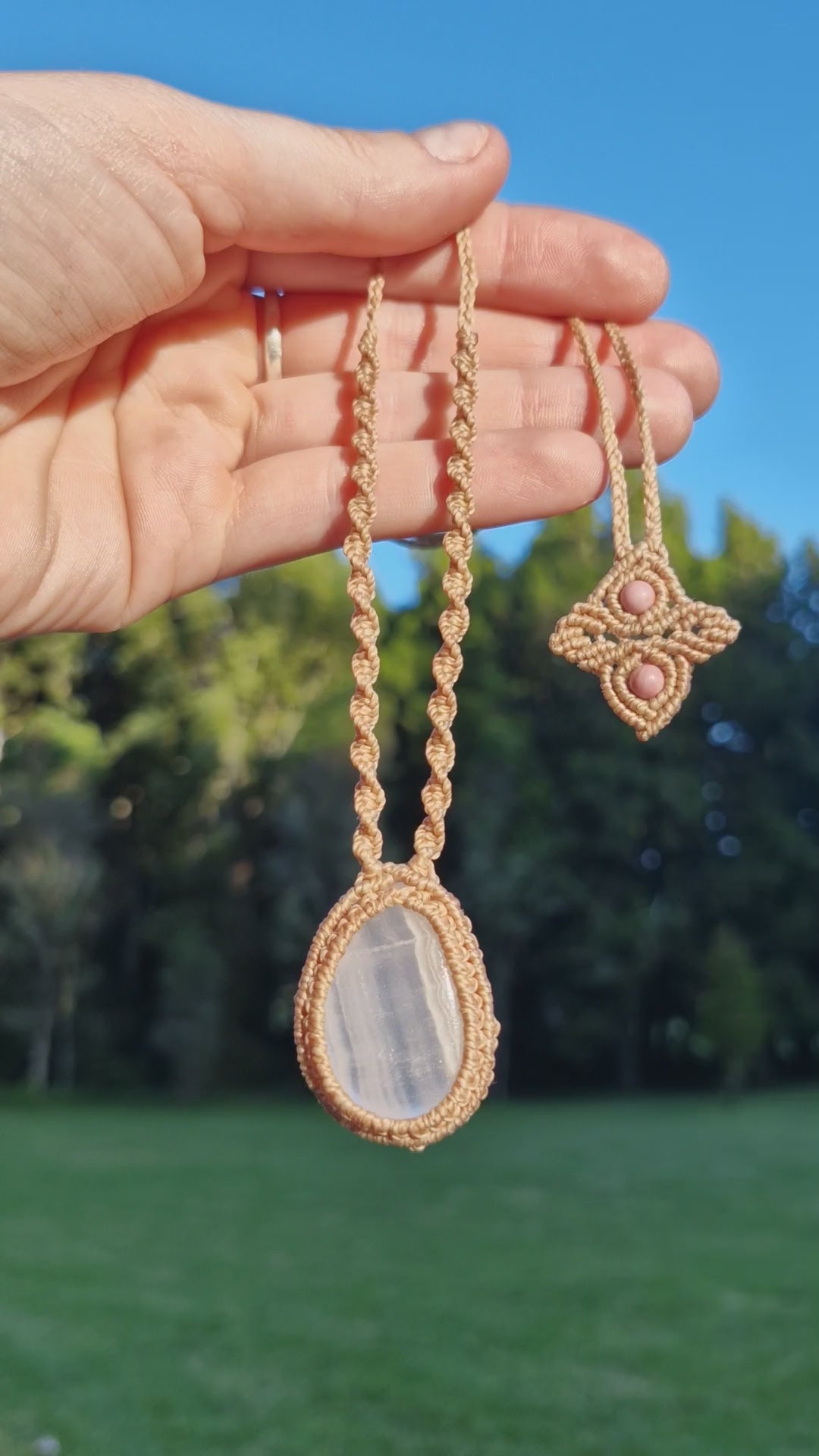 Light pink mangano calcite handwoven macrame pendant. With rhodonite beads