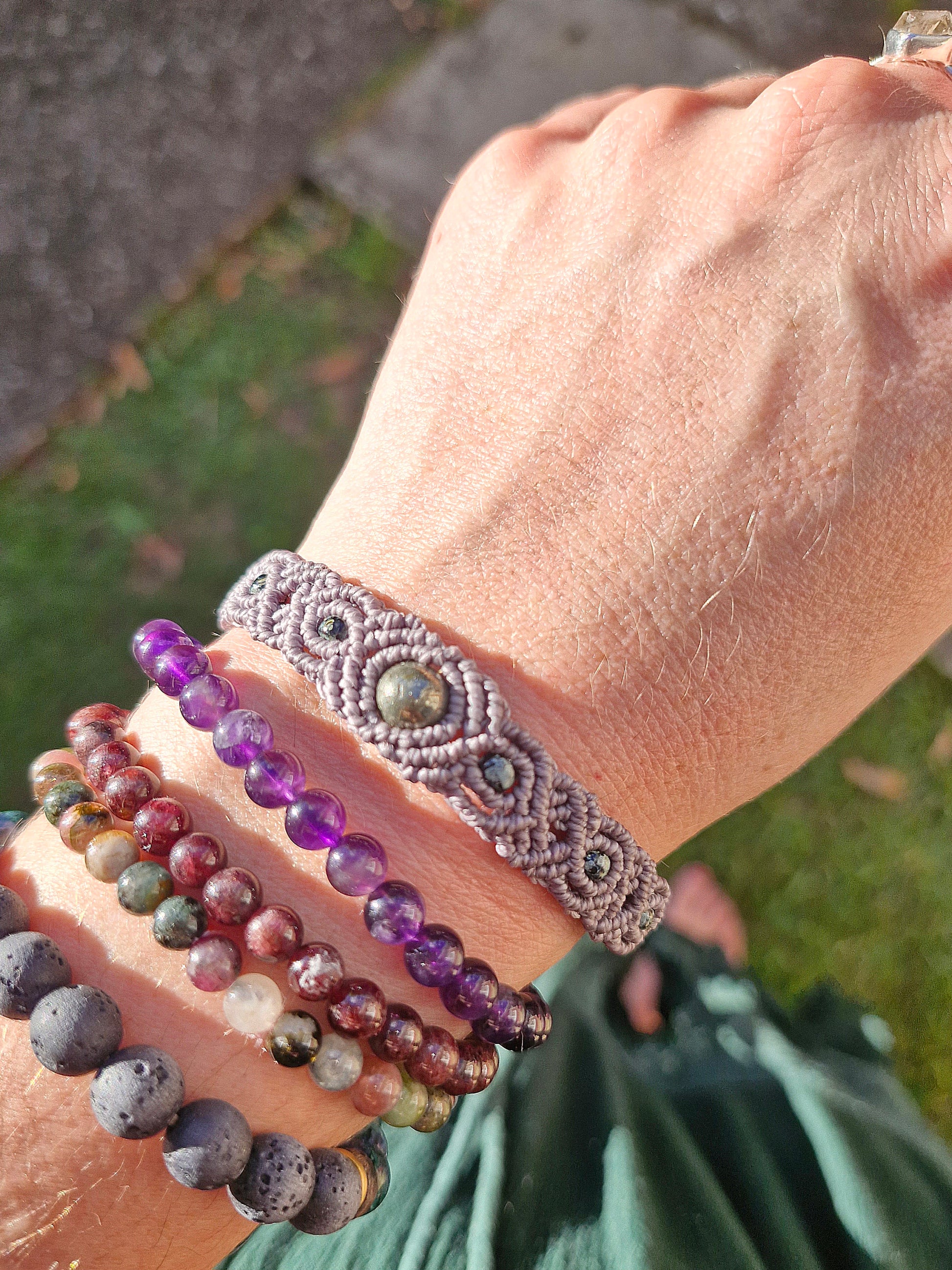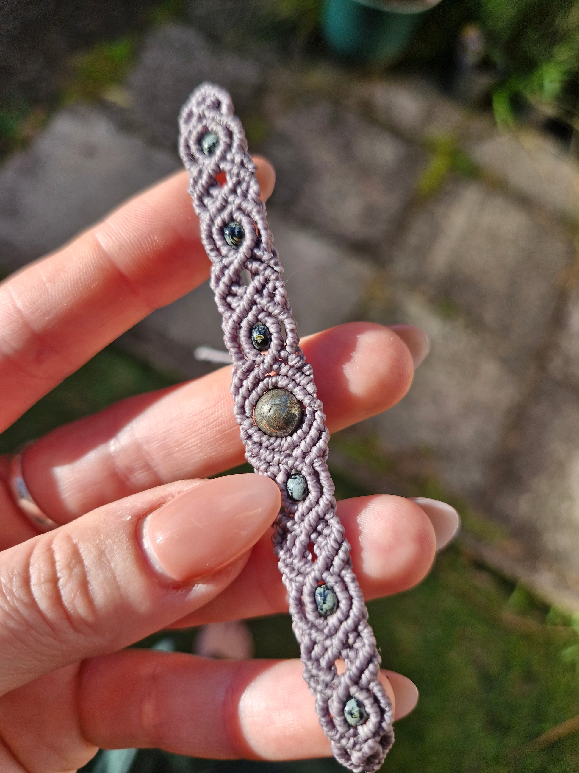 Woven with Brazilian waxed cord for durability. Includes pyrite and Japanese glass beads.
