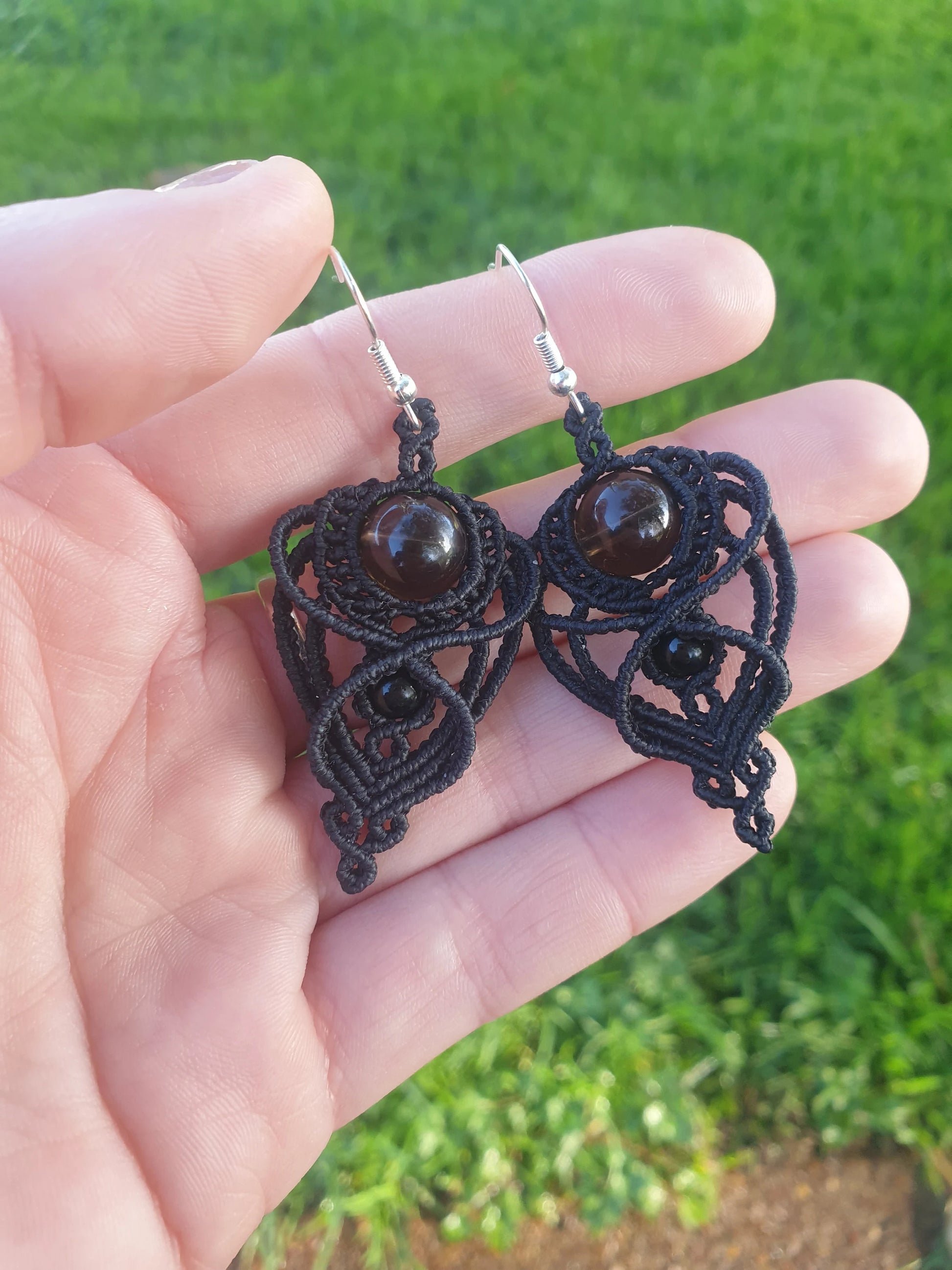 Fae Smokey Quartz and Obsidian Macrame earrings