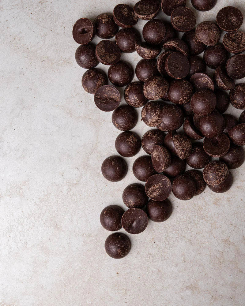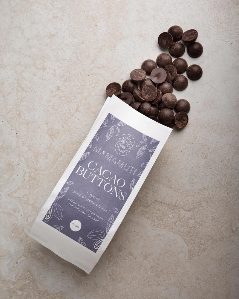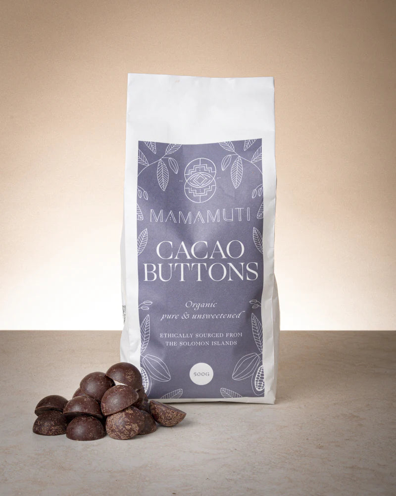 The Solomon Islands cacao beans used to make Mamamuti's bespoke buttons are harvested and fermented for 7 days, then sun dried and gently roasted over a low heat, cracked and winnowed. The nibs are then stone ground for over 24 hours and allowed to set as a paste. With the help of The Cacao Ambassador the paste is then transformed into easy to measure buttons, so you have no need to grate or chop your paste before using. This entire process is done by hand in micro batches. The buttons are not tempered to standardise the appearance like in industrial chocolate. Every batch is variable in appearance reflecting the season and the wisdom of nature. The overall tasting notes of berry, plum and rich chocolate and quality are consistent.