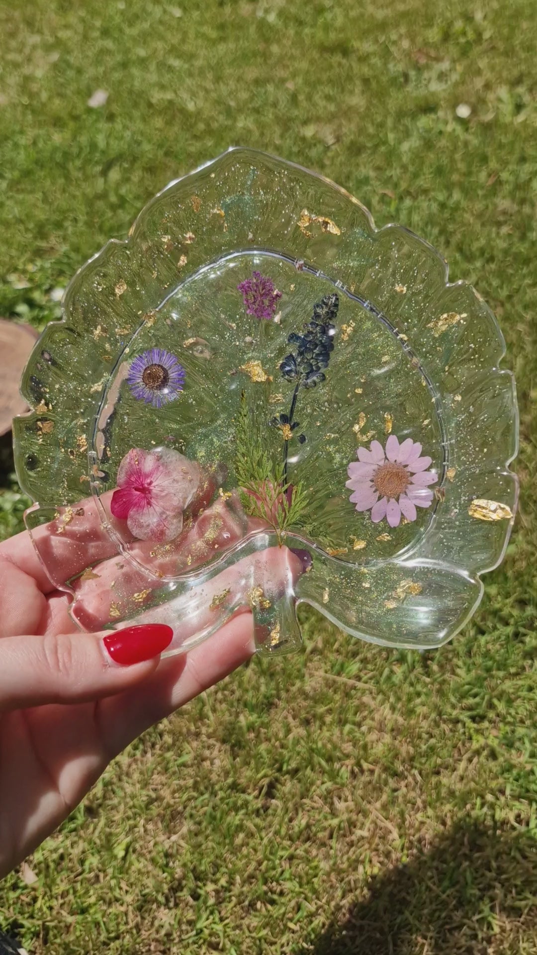 Palm Leaf resin tray with a spring bouquet of dried flowers and pops of gold foil